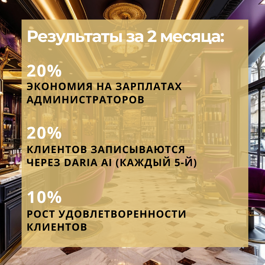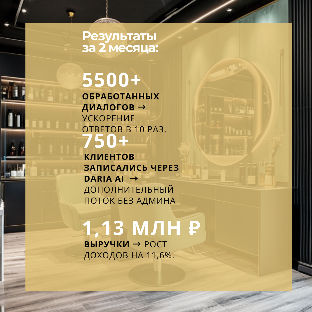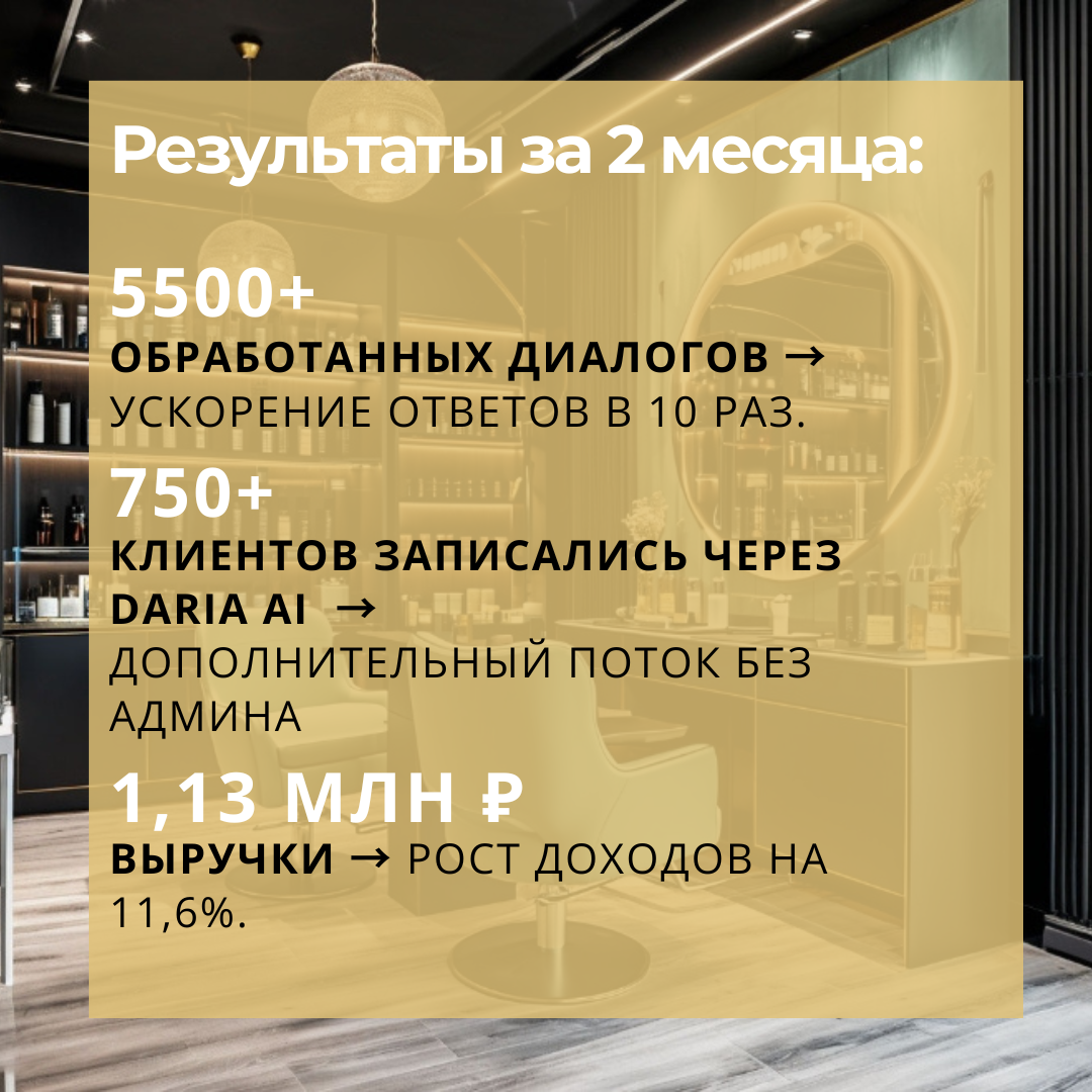 ✔ Глубокая персонализация – детальная настройка идеального администратора под специфику салона: тон общения, индивидуальные сценарии, работа с VIP-клиентами.